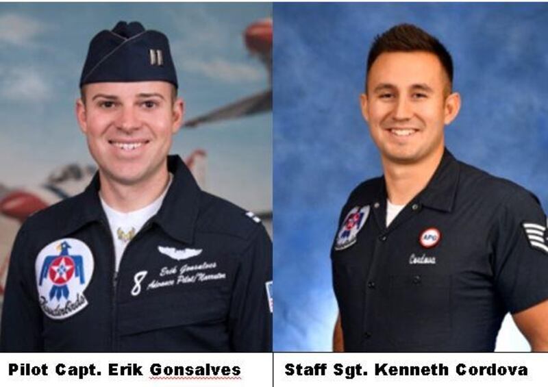 The pilot, Capt. Erik Gonsalves, is the advance pilot/narrator for the U.S. Air Force Air Demonstration Squadron, flying the No. 8 jet, according to an Air Force biography.