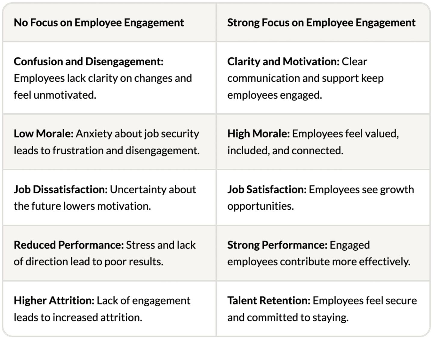 By prioritizing engagement, organizations can minimize uncertainty, improve retention, and create a smoother transition for employees.