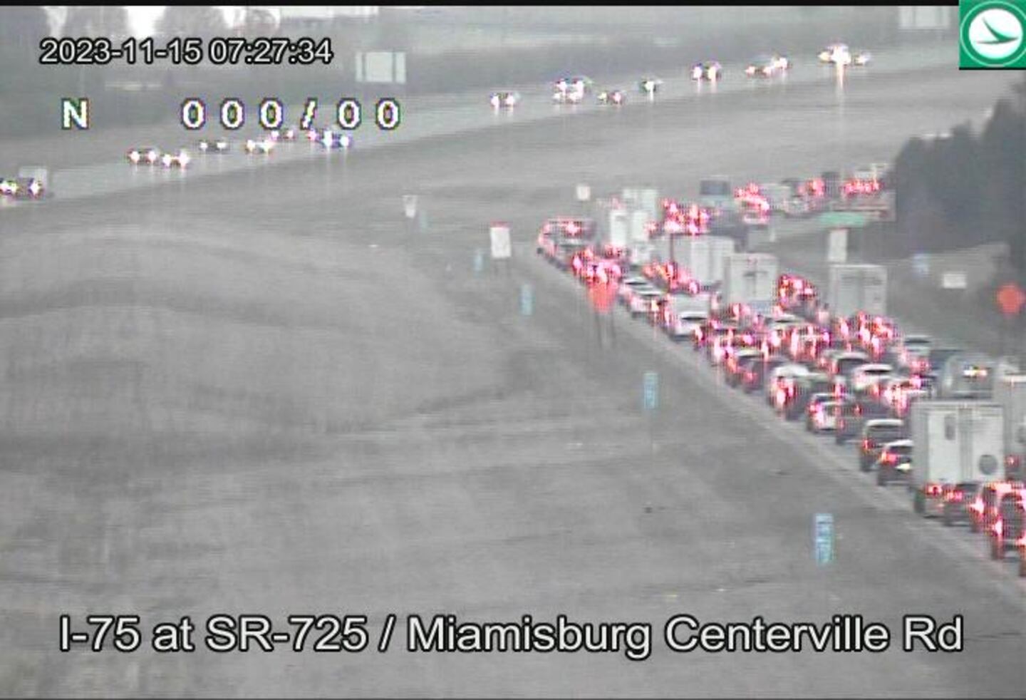 - The right lanes are blocked following a crash on Northbound Interstate 75 between State Route 725 and N. Dixie Drive, according to ODOT cameras. Officers and medics are at the scene. Traffic is backed up past State Route 725 on NB I-75.