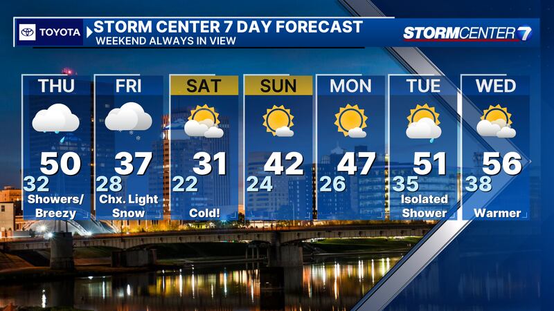 Some accumulation is possible, especially after sunset. With area of low pressure passing well to our south, only light snow is expected across the Miami Valley at this time with totals around an inch or less. Daytime highs in the mid 30s. Overnight lows falling to the low 20s.