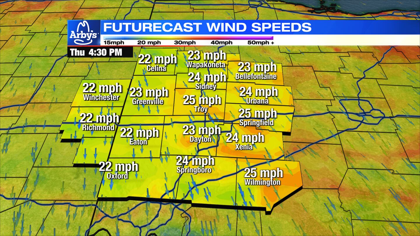 THURSDAY: Mostly cloudy to partly cloudy skies expected on Thursday. Storm Center 7 Chief Meteorologist McCall Vrydaghs says it will be much cooler with highs in the middle 60s. Also, breezy to windy at times with gusts near 25mph. Skies clear and winds diminish Thursday night and getting chilly. Temperatures will fall to the lower 40s with wind chills in the 30s by morning.