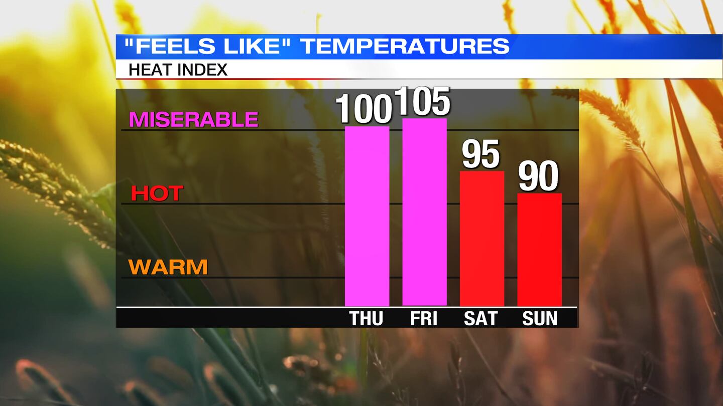 FRIDAY: Hot and humid. High temperatures in the mid-90s. Heat Index in the low to mid 100s.