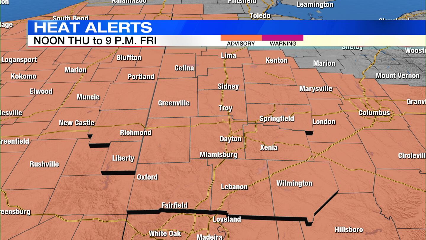 The National Weather Service has issued a Heat Advisory starting noon Thursday for Auglaize, Butler, Champaign, Clark, Clinton, Darke, Greene, Logan, Mercer, Miami, Montgomery, Preble, Shelby and Warren in Ohio; Randolph, Union and Wayne in Indiana until 9 p.m. Friday.
