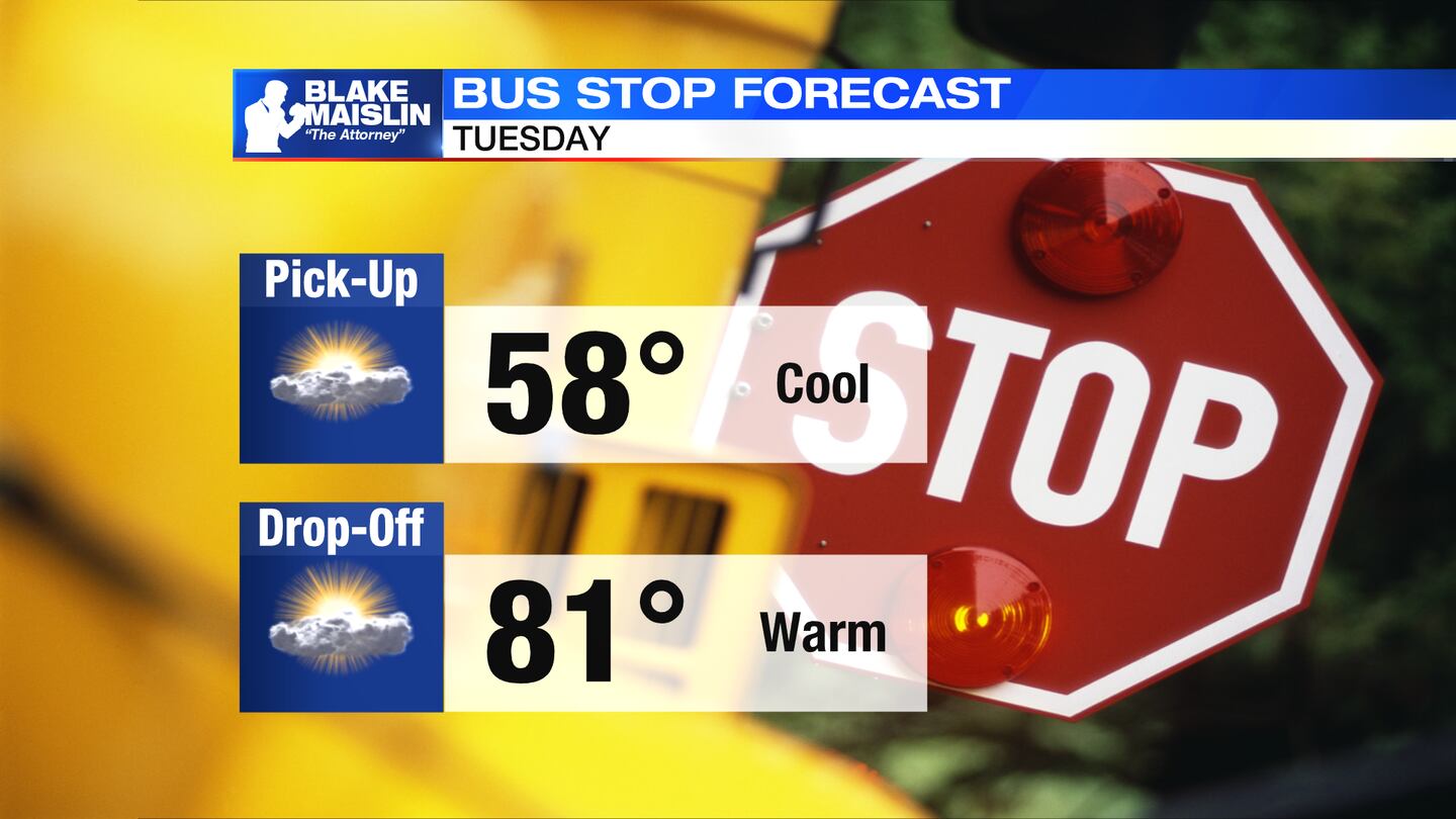 TUESDAY: Sunshine and warm temperatures continue for Tuesday. Highs in the lower to middle 80s.