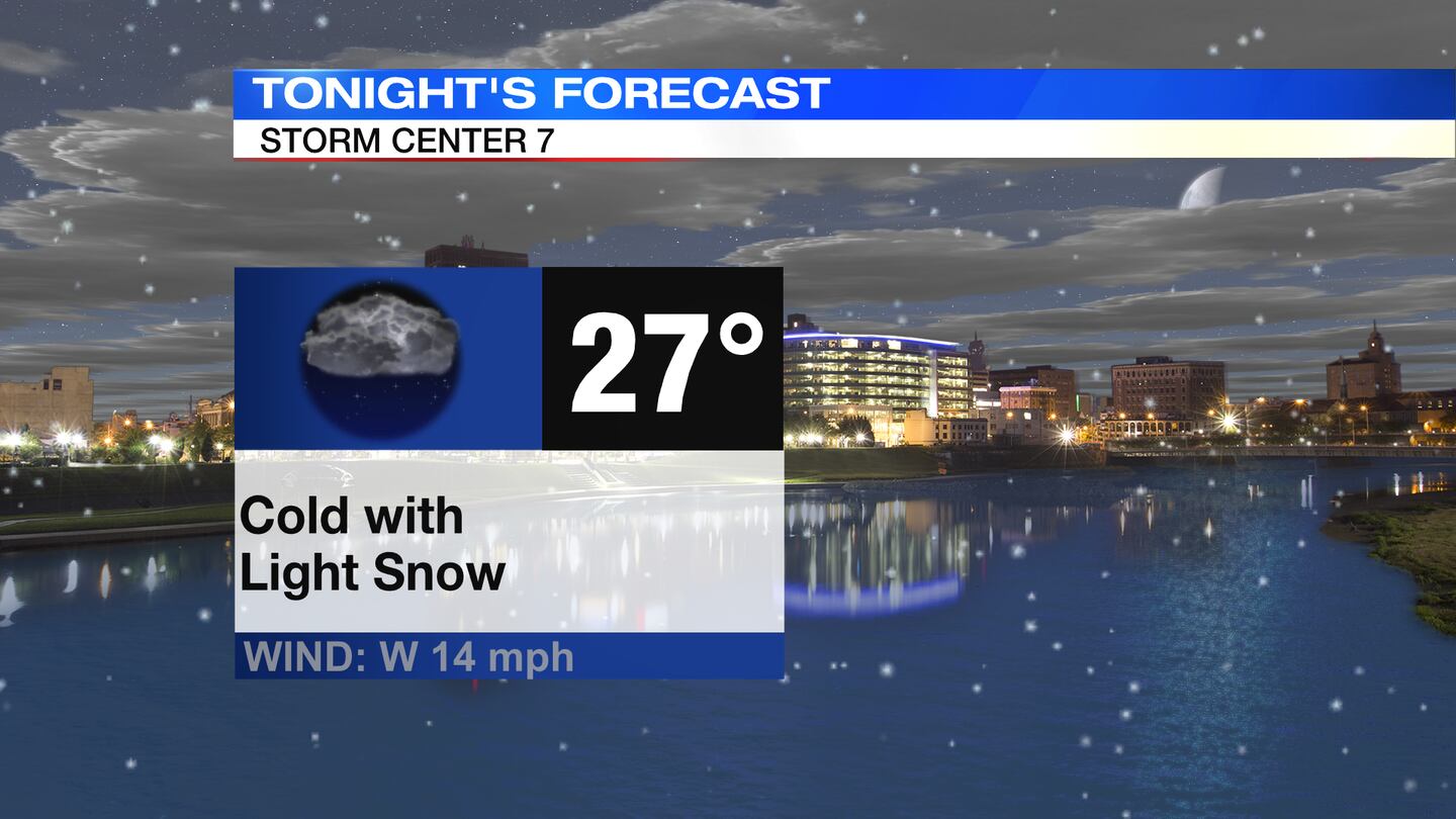 OVERNIGHT: Cloudy and cold tonight with a few flurries or snow showers at times, according to Storm Center 7 Chief Meteorologist McCall Vrydaghs. A quick coating of snow is possible, and some isolated slick spots could develop as a result.
