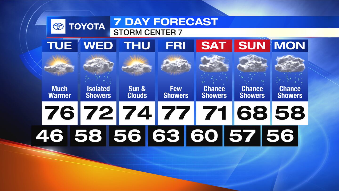 FRIDAY: A few rain showers are possible with highs in the mid to upper 70s.