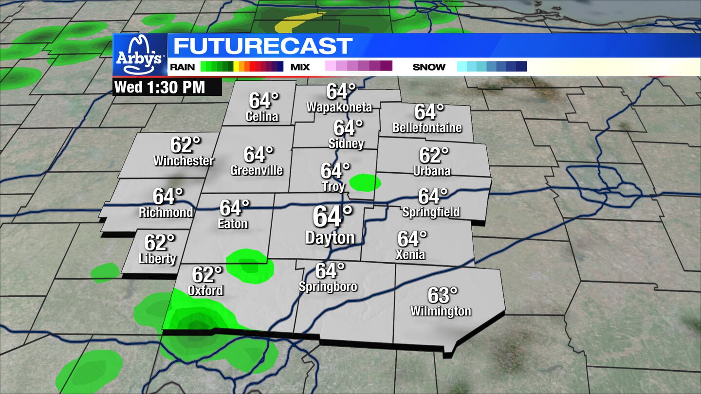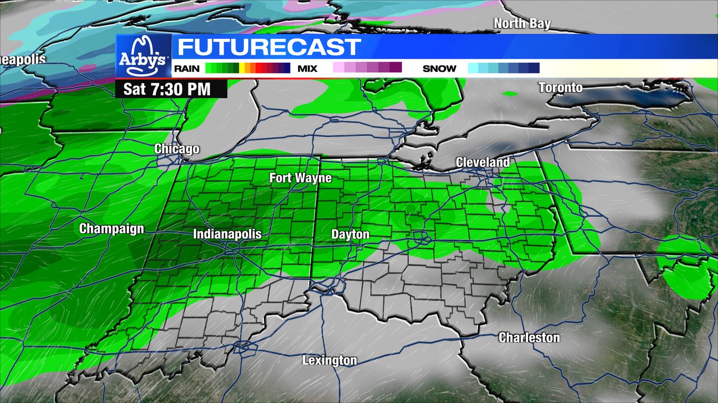 SATURDAY: Rain looking likely. Still warm with highs near 70.