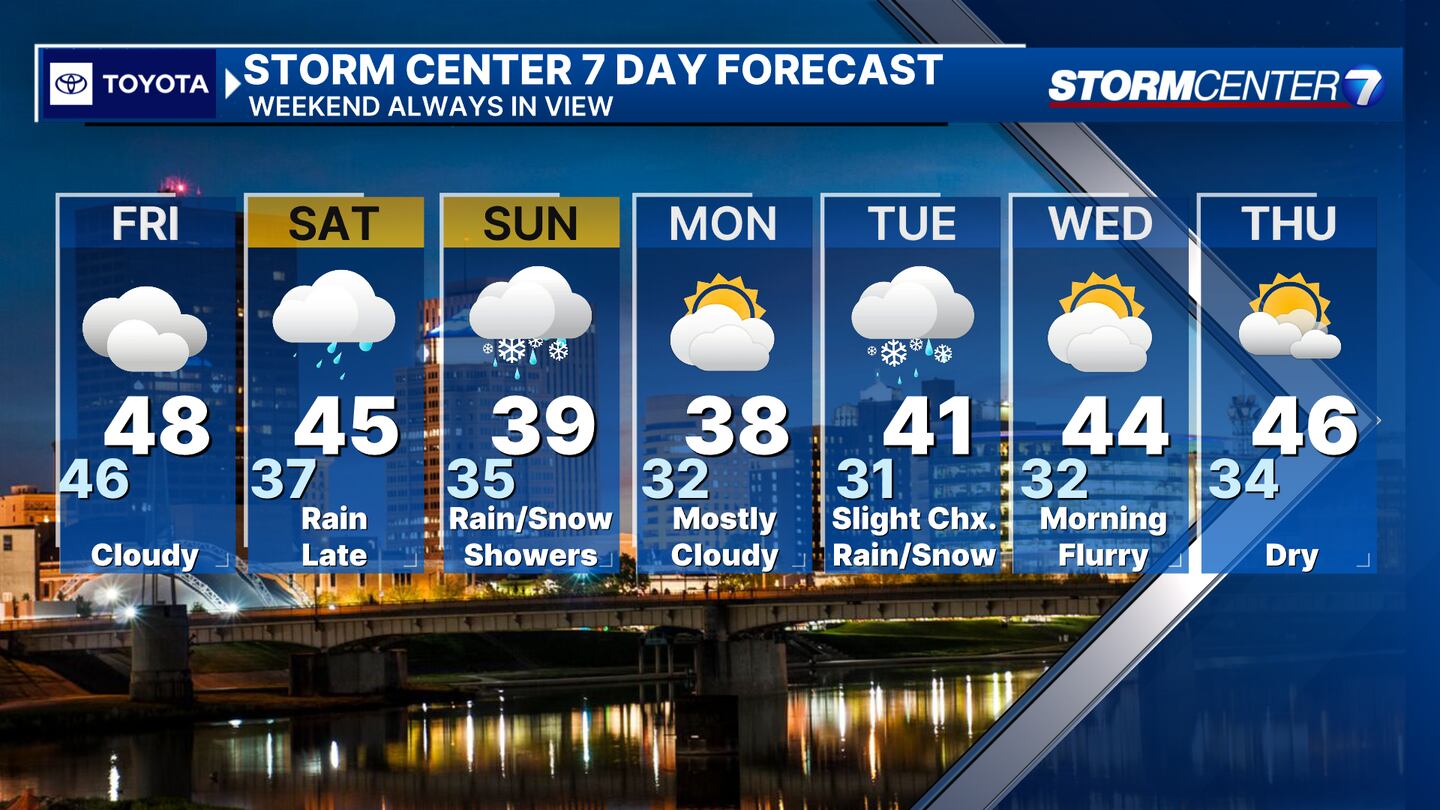 SATURDAY: Cloudy and mostly dry during the day. A chance for showers by late afternoon, continuing through Saturday night. As weather cools Saturday night, rain may mix with snow. Lows in the mid-30s.