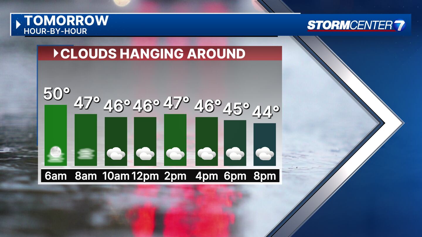 TONIGHT: Cloudy this evening with the next round of rain arriving. Showers will be possible from around 5 p.m. until midnight, according to Storm Center Chief Meteorologist Austin Chaney. Any lingering fog should clear as rain moves through.