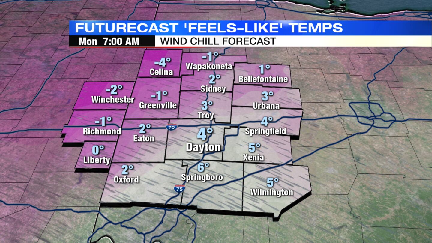 Wednesday: Wind chills once again start below zero then mostly sunny with highs in the middle 20s.