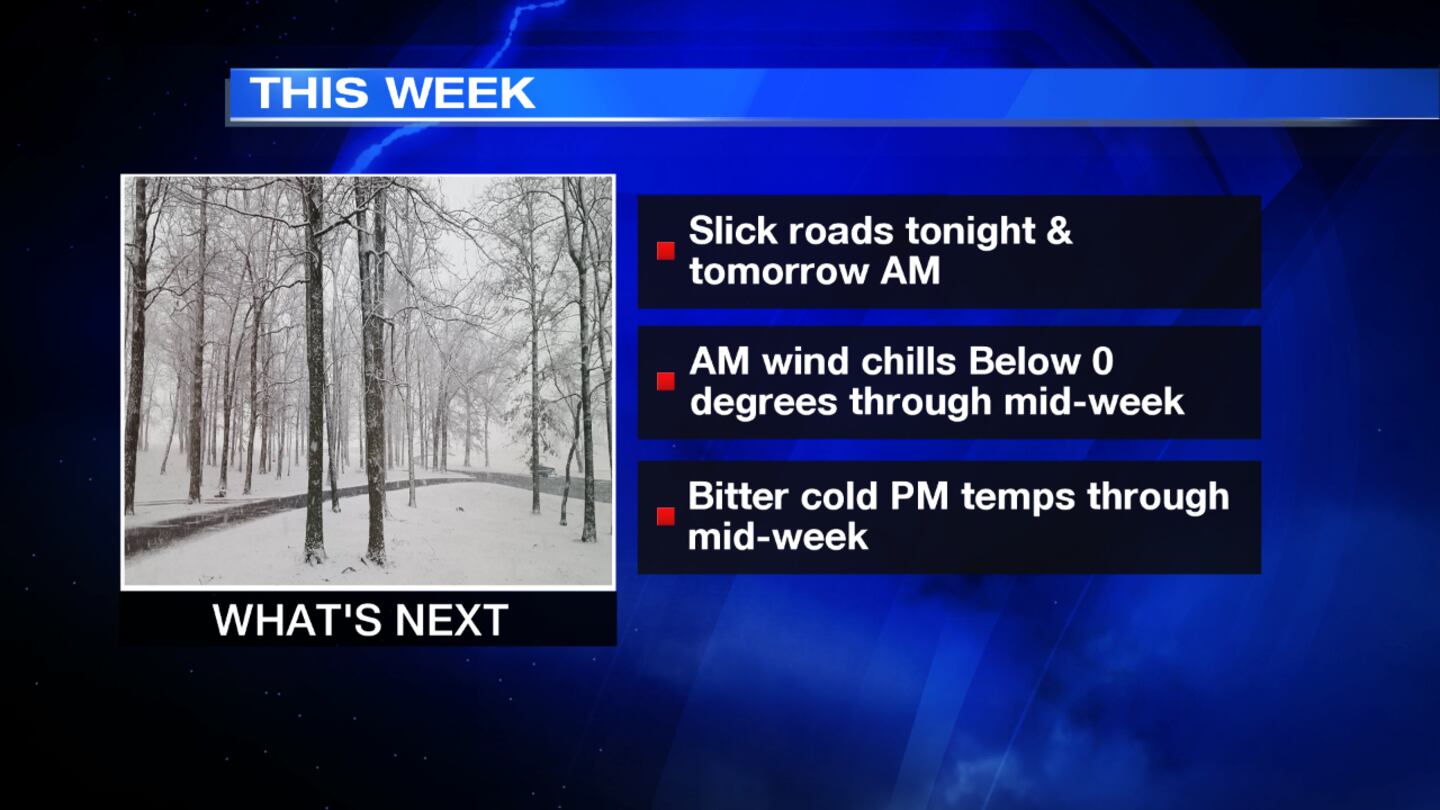 Tonight: Cloudy with maybe a few passing flurries. Untreated roadways will be slick with the dropping temperatures. It will be breezy and temperatures will be in the mid teens. Wind chills first thing in the morning will be below zero, making it a really cold and slick morning commute.