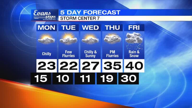 Monday: A few morning flurries possible with wind chills in the single digits to start the day. Skies clear by the afternoon with highs near 20 degrees.
