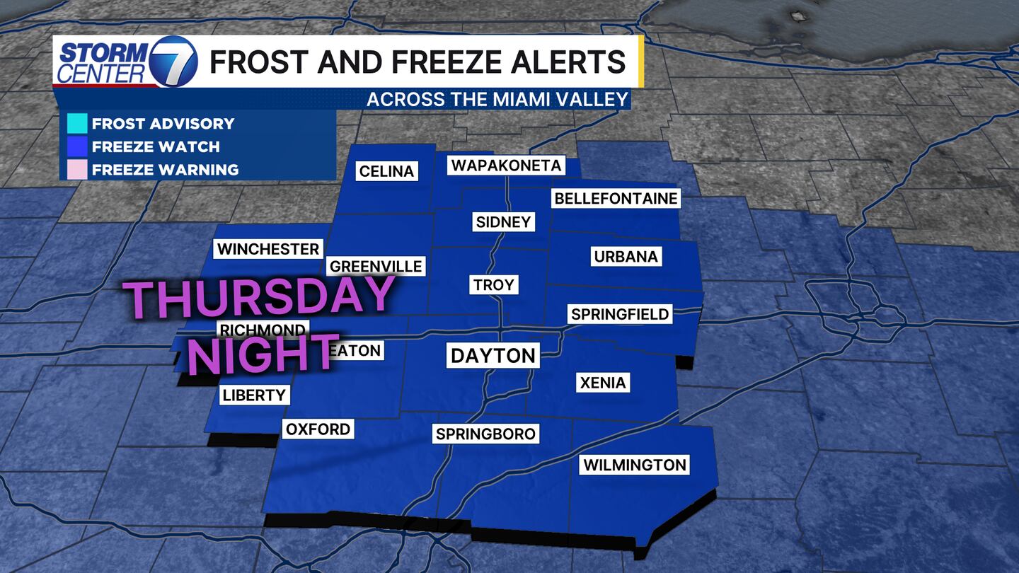 Tomorrow night, we’ll have a much clearer sky and lighter winds area wide. This will allow all of us to get cold enough for widespread frost with temperatures in the low to mid 30s. Some spots may even dip below freezing. A freeze watch is in effect for Thursday night.