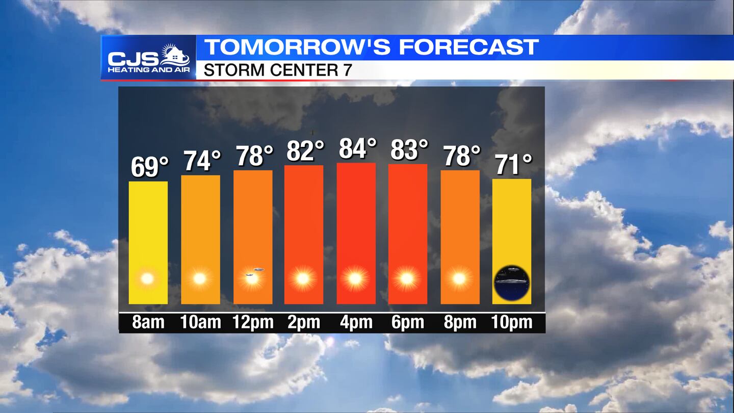 TOMORROW: Mostly sunny, less hot and humid with highs in the mid 80s.