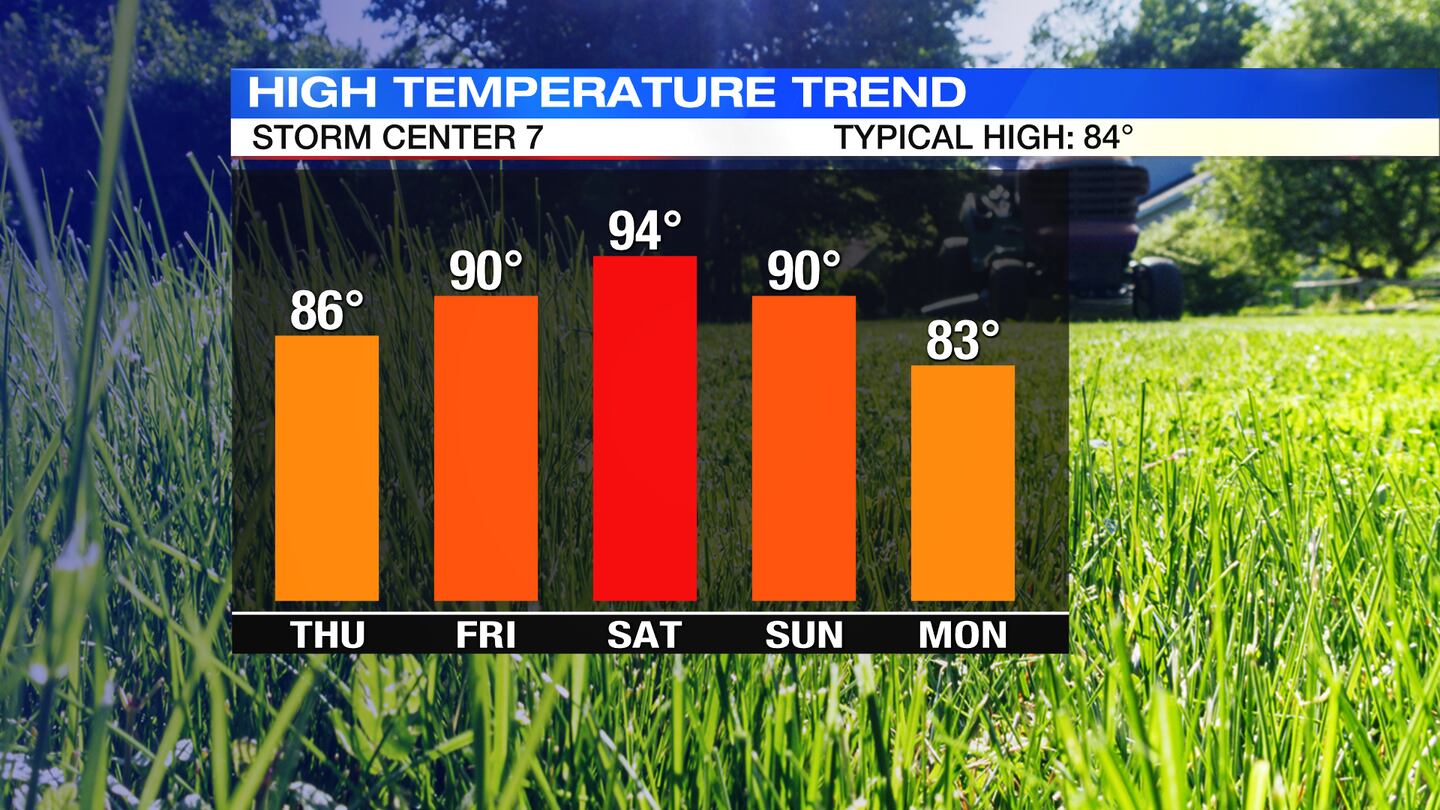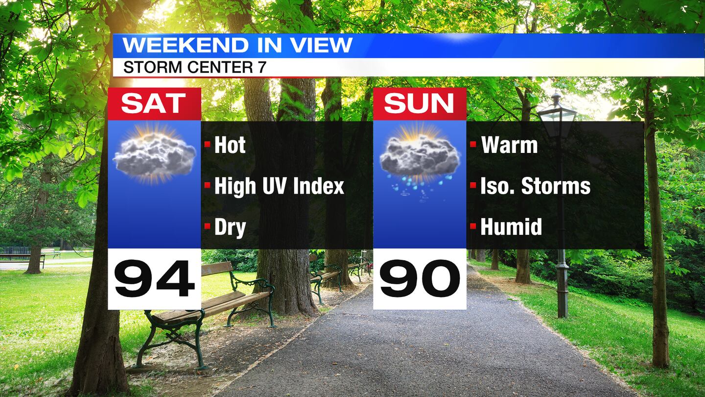 SATURDAY: Mostly sunny and hot with humidity increasing, temperatures will climb into the 90s.