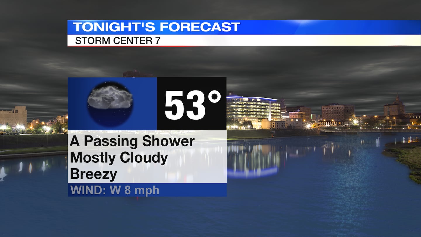 TONIGHT: Clouds thicken ahead of an approaching cold front, according to Storm Center Chief Meteorologist Austin Chaney. This front may bring us a few light rain showers after sunset tonight. Breezy. Some gusts to 25+MPH through sunset, gradually decreasing throughout the night. Temperatures fall from the upper 60s and lower 70s this evening to the lower 50s overnight.