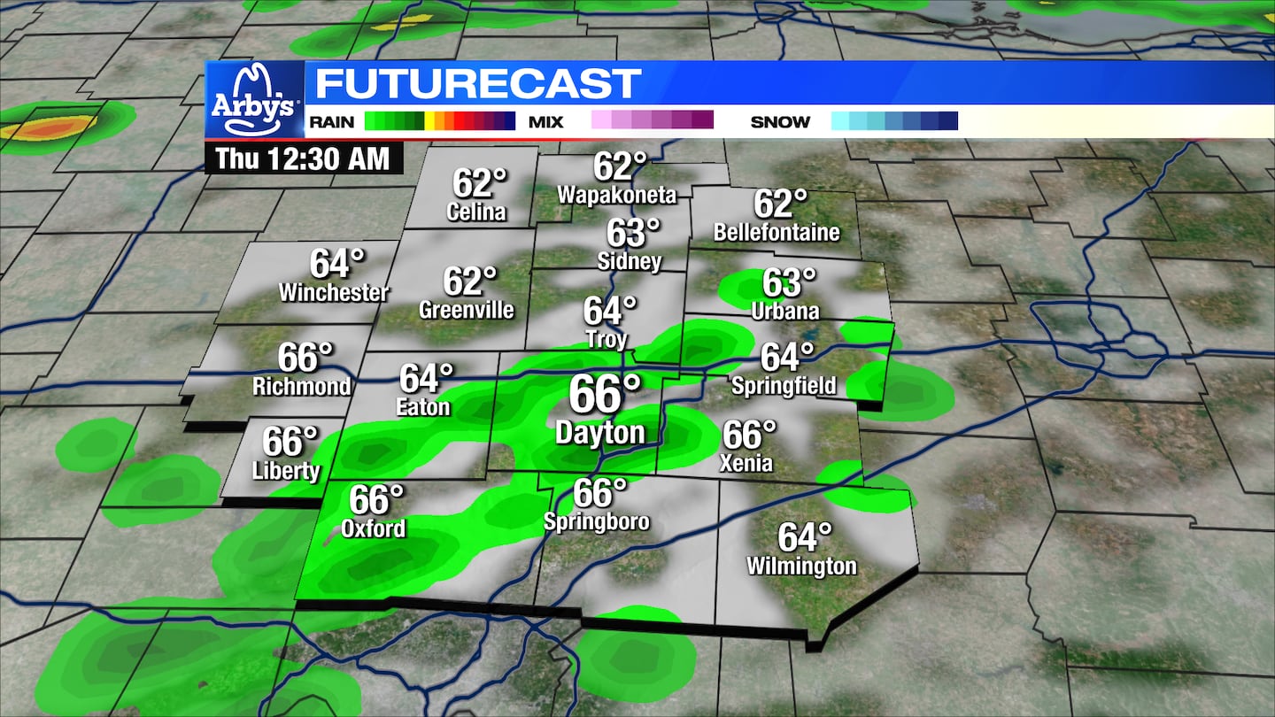 TUESDAY: Clouds early with more sun as the day goes on. Dry during the day. Highs will range from the upper 50s across the northern Miami Valley to the mid-60s from Dayton and points south. A chance for showers returns late Tuesday night into early Wednesday.