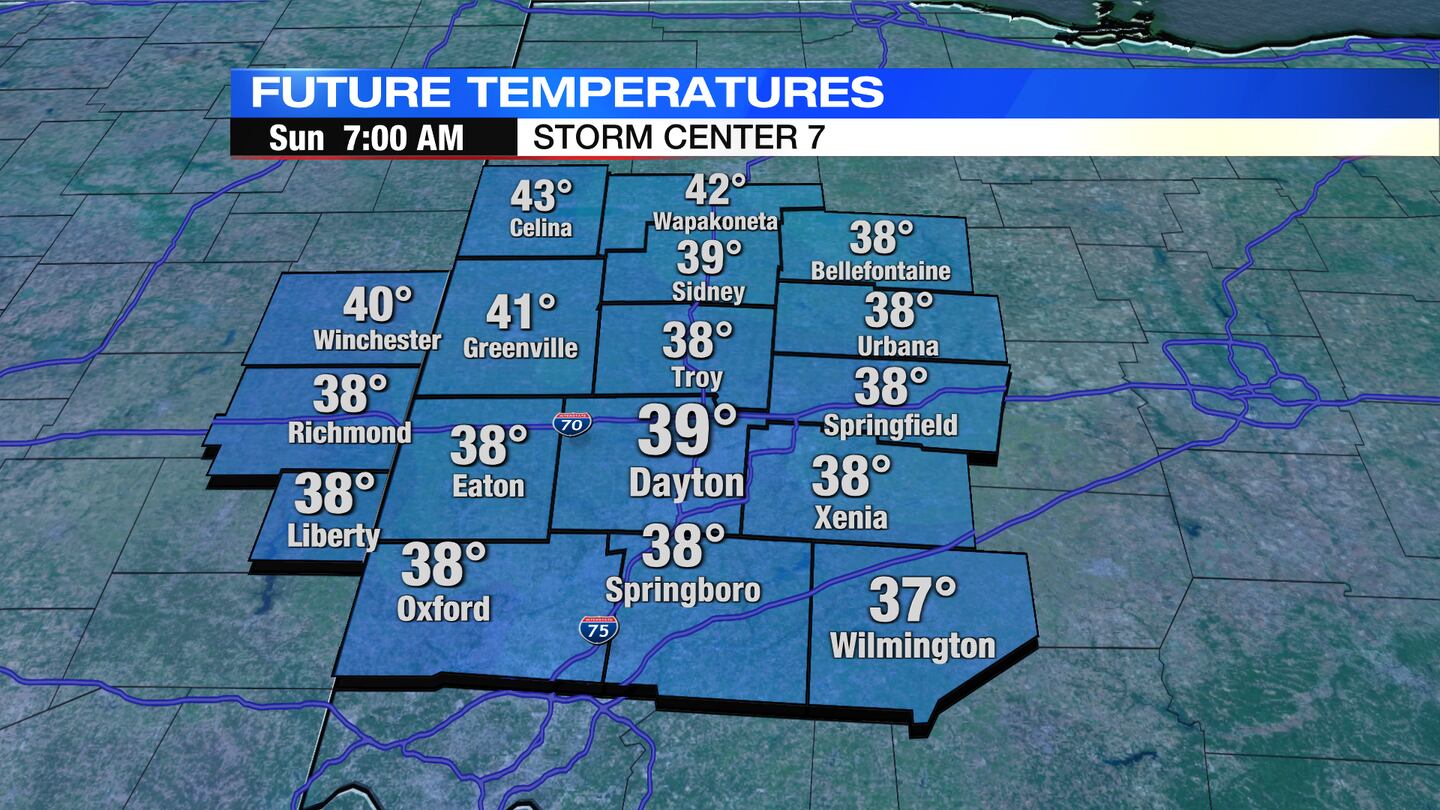 SUNDAY: A cold start with morning lows in the upper 30s to lower 40s. As of now it looks like a light breezy Sunday morning should help us avoid any risk for frost. Partly cloudy during the day with high temperatures again in the upper 50s.