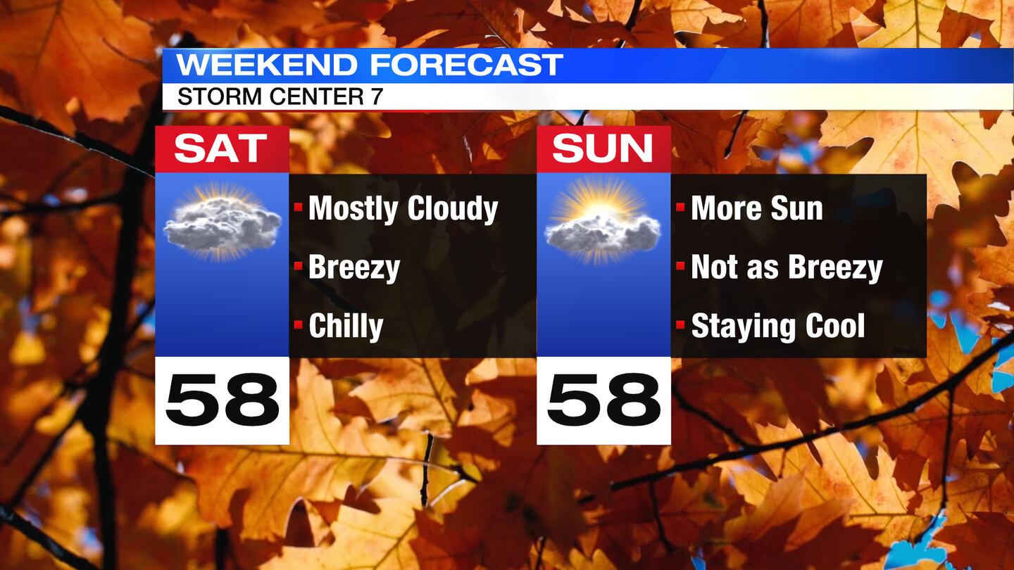 SATURDAY: Mostly cloudy, cool, and breezy for Saturday. A few light rain showers can’t be ruled out. Highs only get to the upper 50s making it the coolest day since early May. Winds gusting as high as 30MPH will make it feel even chillier.