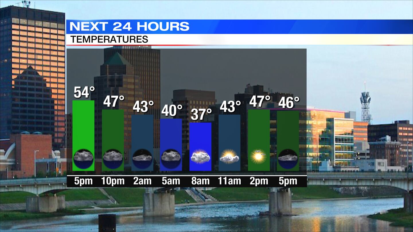 SATURDAY: Partly cloudy and chilly with highs in the lower 40s.