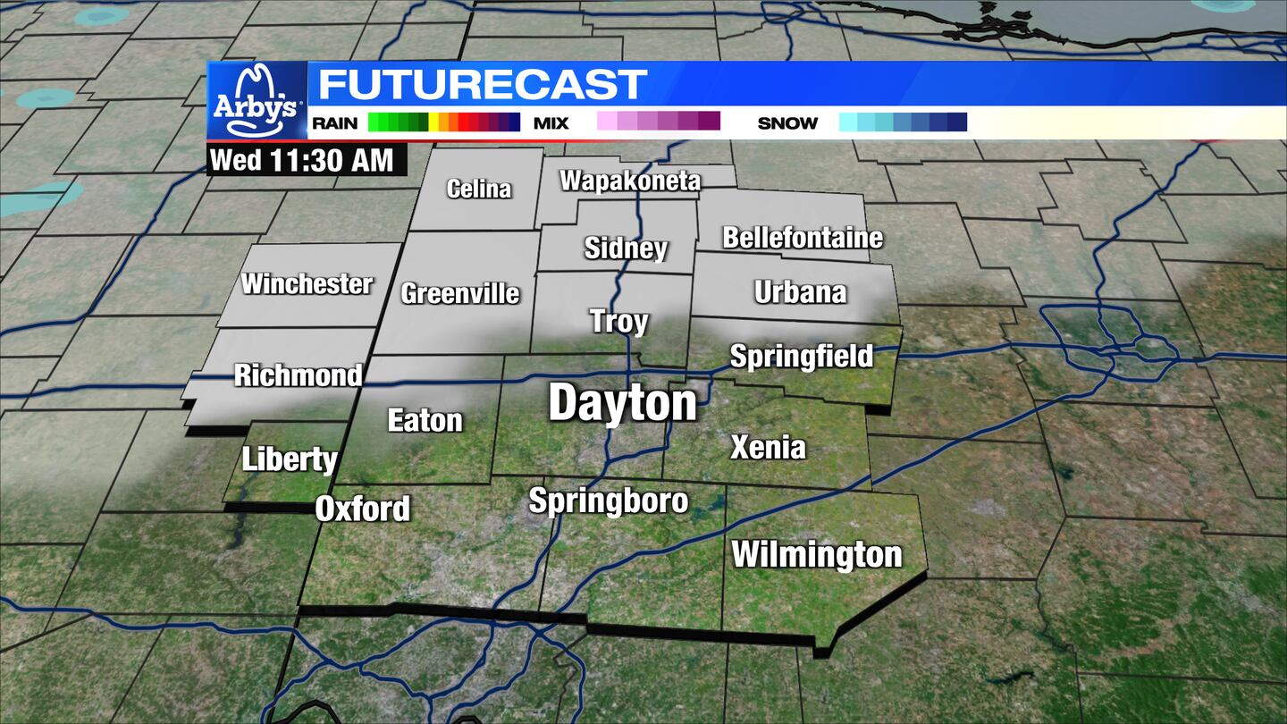 WEDNESDAY: Mix of clouds and sunshine. Passing p.m. flurry possible. Highs in the lower 40s.
