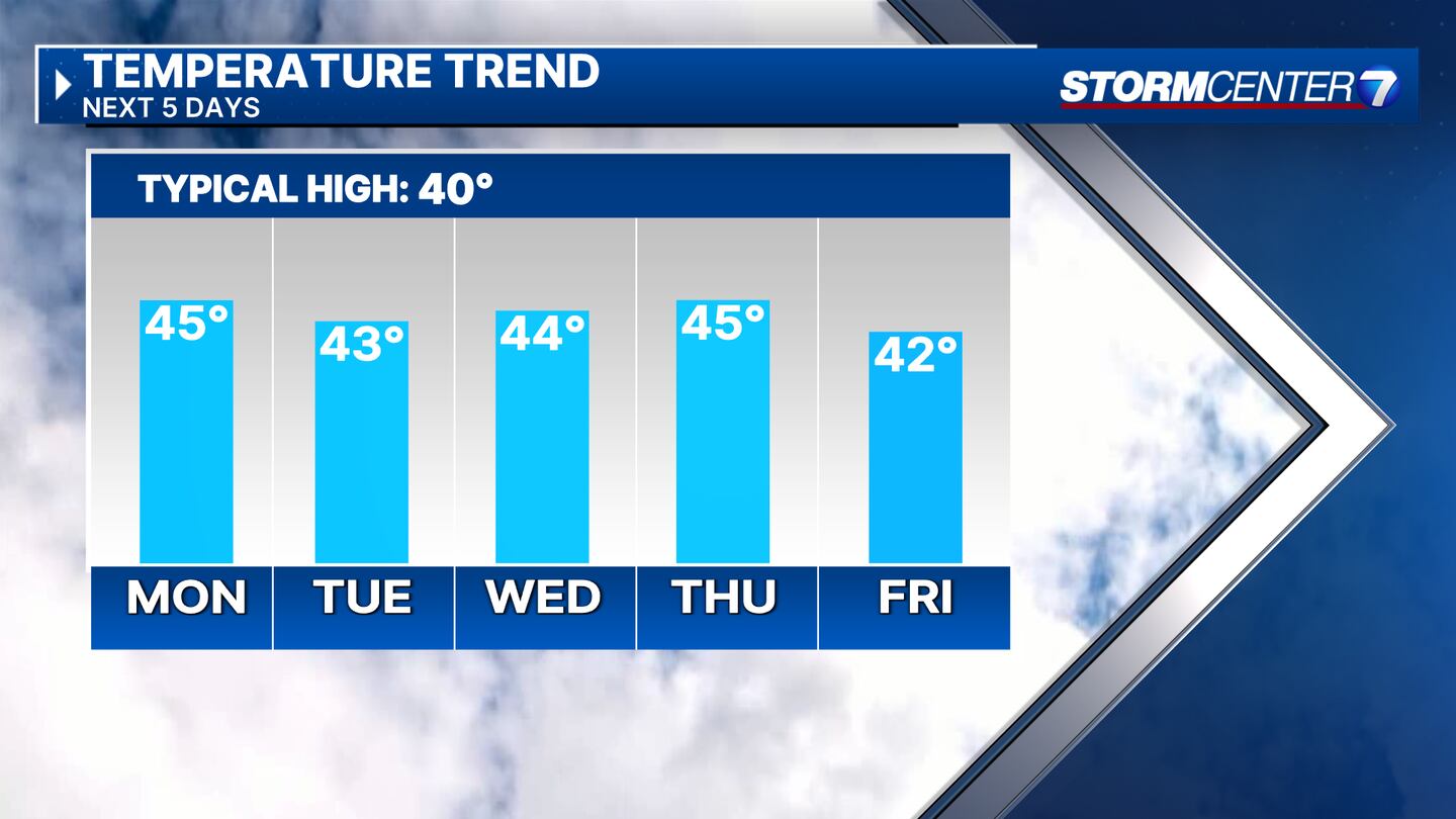 FRIDAY: Cooler and mostly cloudy with highs in the lower 40s.