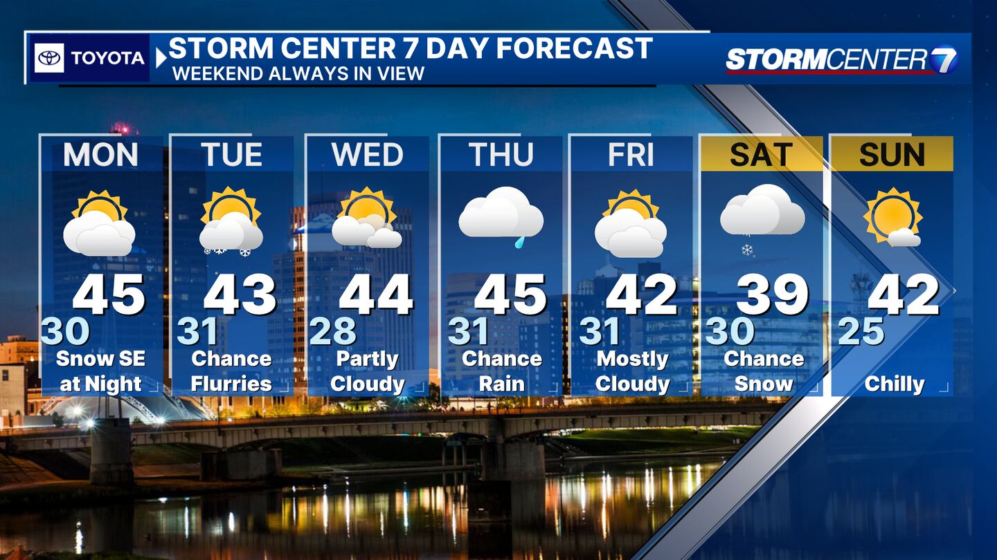 MONDAY: Clouds are increasing with a chance for rain showers mainly southeast of Dayton arriving around sunset. Highs in the mid to upper 40s. Overnight, a storm system tracks to our southeast. Southeastern portions of the Miami Valley may get clipped with snow, but it looks less likely that folks north of an Oxford, to Dayton, to Springfield line see much of anything. South of that line, some accumulation is possible mainly on grassy surfaces. Lows in the upper 20s to lower 30s.