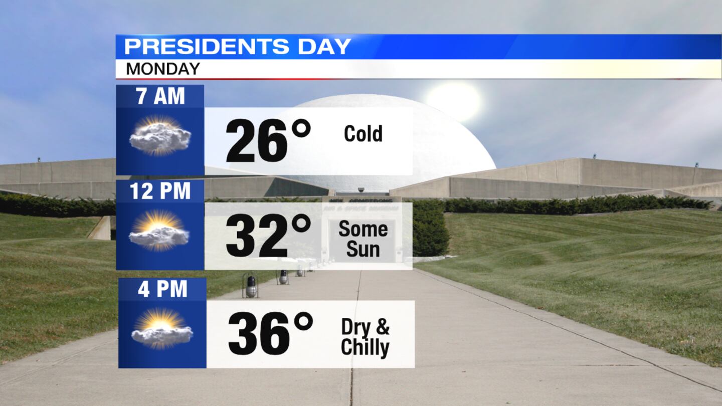 President's Day: A few slick spots Monday morning are possible to start, but shouldn't be a big problem. Mostly cloudy and chilly for the remainder of the day with highs in the middle to upper 30s.