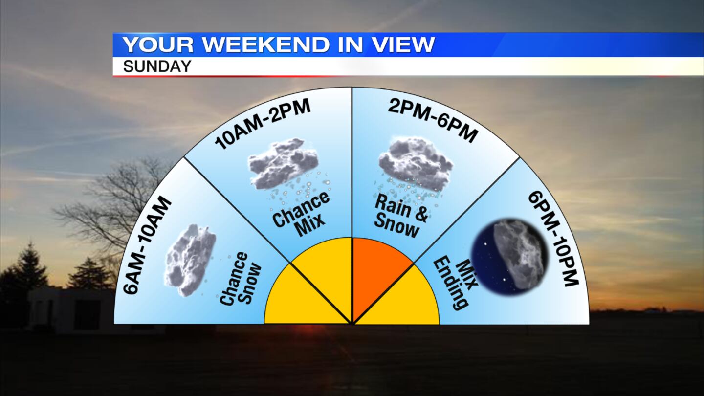 Sunday: Scattered snow showers move in quickly. Temperatures climb to the middle 30s, so some rain will mix in from the south for the afternoon. Snow showers end quickly into the evening with a dusting to an inch possible.