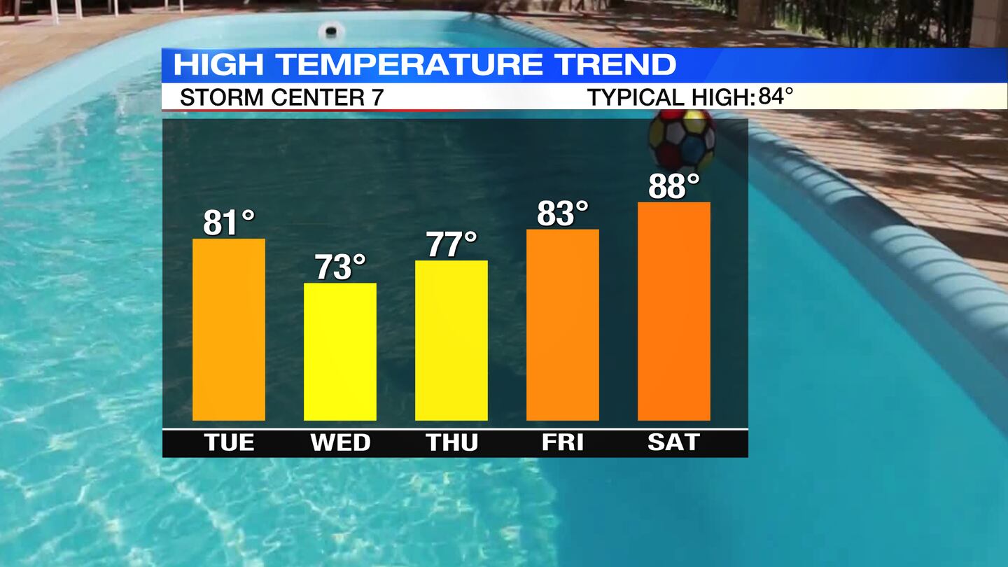 WEDNESDAY: Cooler on Wednesday with highs knocked back to the middle 70s. Patchy fog lifts and skies turn clear.