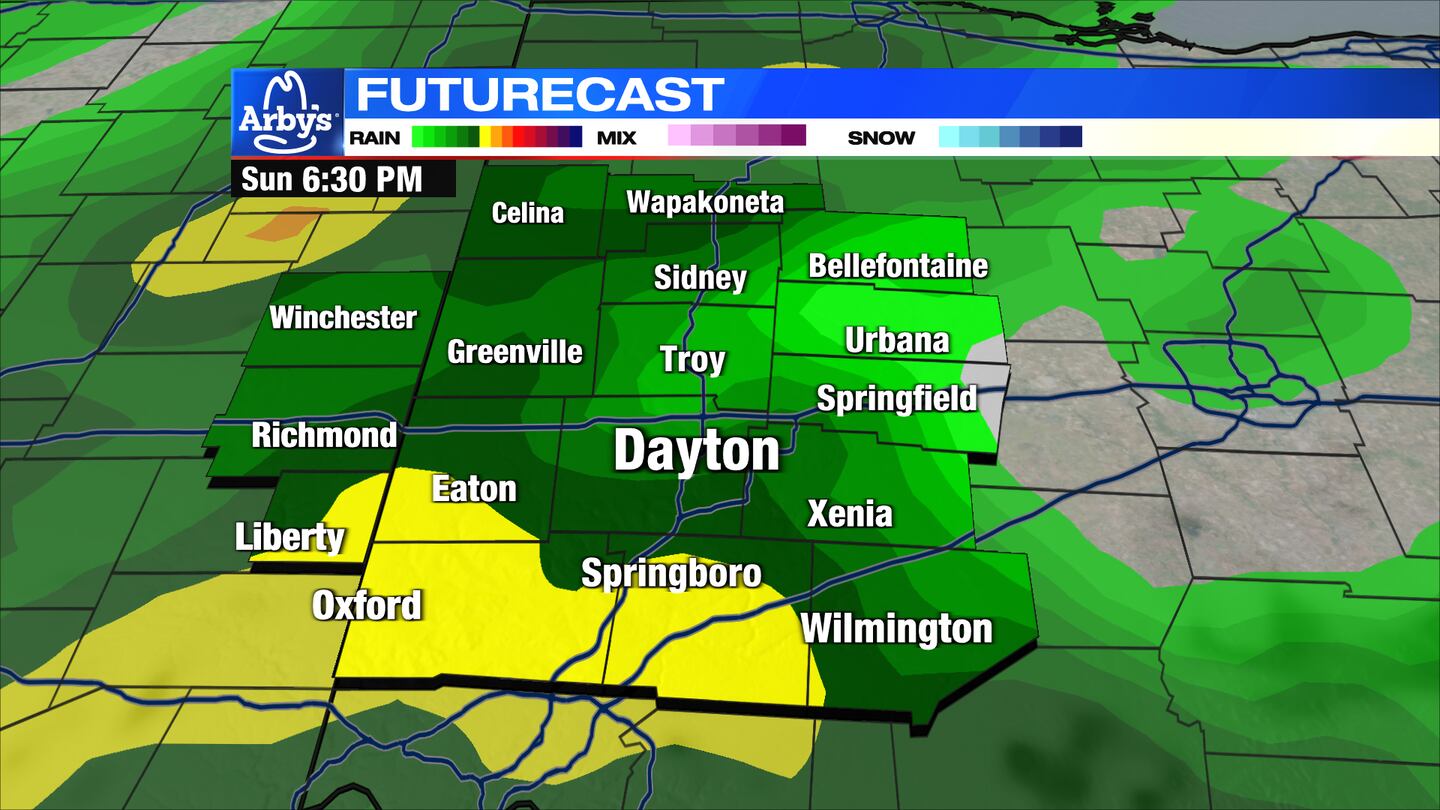 MONDAY: Rain and a few storms, especially early. Otherwise mostly to partly cloudy. High temperatures will be cooler, in the low 70s