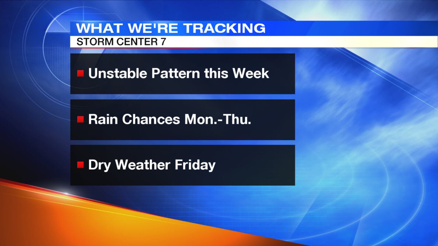 On and off storms will continue tonight and through Tuesday, some of which could be strong to severe, according to Storm Center 7 Chief Meteorologist Eric Elwell.