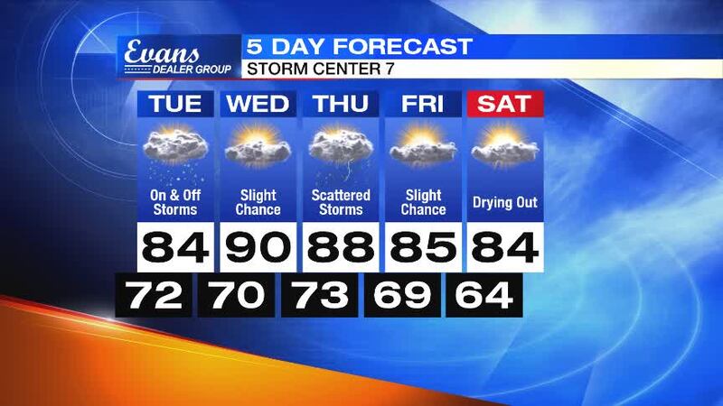 WEDNESDAY: Partly cloudy skies are expected with a chance for a passing shower or storm. It will be hot and humid with highs nearing 90 degrees.