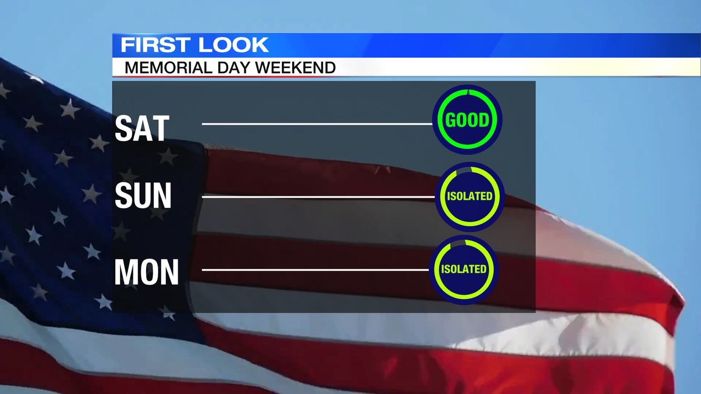 MONDAY (MEMORIAL DAY): Mostly sunny and warm with highs in the lower 80s. A stray shower is possible.