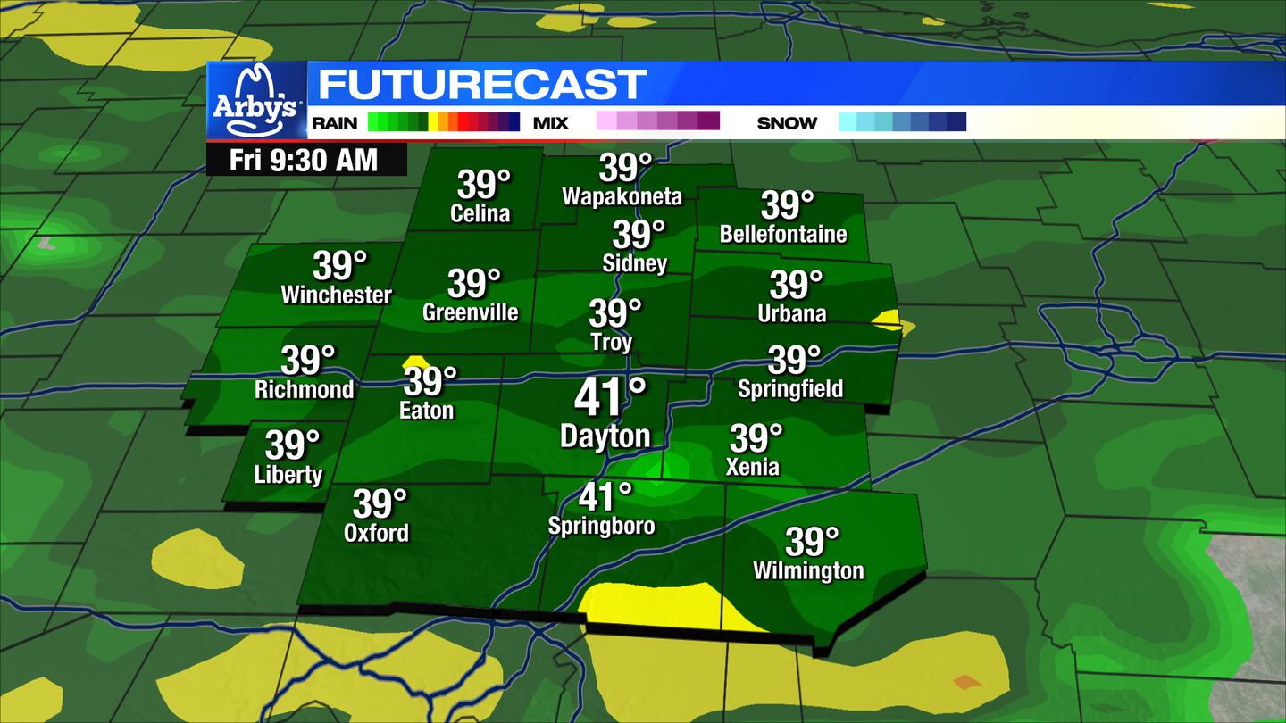 FRIDAY: A sloppy morning commute is likely with widespread rain moving through around daybreak. Rain becomes more scattered during the afternoon. Rainfall totals around .25″ to .5″. Much of the day will be spent in the 40s. We may briefly get to 50 late in the evening.