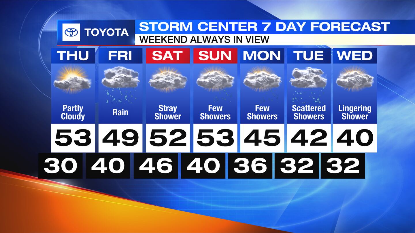 SATURDAY: Mostly cloudy skies with highs in the upper 40s and lower 50s. A stray shower can’t be ruled out.