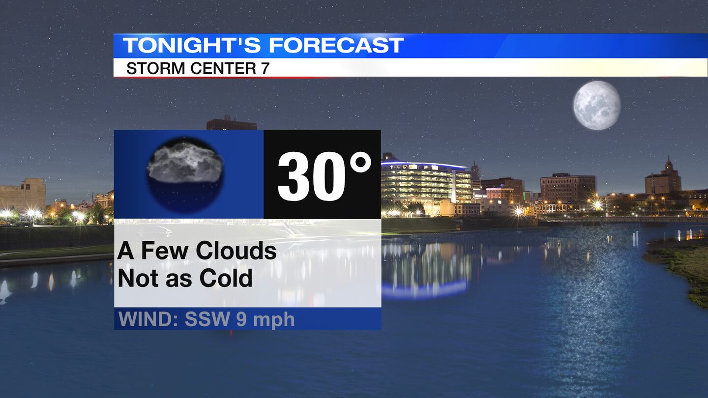 WEDNESDAY: Clear skies from this evening into tonight, according to Storm Center 7 Chief Meteorologist Austin Chaney. A southwest breeze persists, which means we won’t be as cold as the previous two nights. Expect a morning low around 30 with wind chills in the 20s.