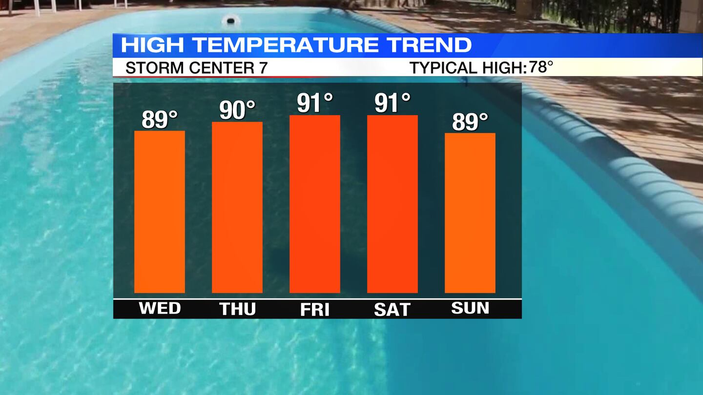 WEDNESDAY: Mostly sunny, with stray showers possible. Above-average highs in the upper 80s and low 90s.
