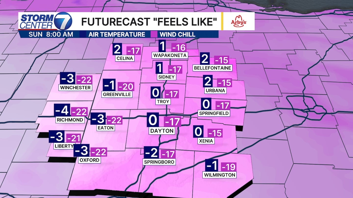 The cold will be a serious problem for us. Snowpack and a clearing sky will combine to produce a bitterly cold night. Low temperatures will fall to near zero Sunday morning. It stays windy which will push the wind chills as low as -15. Avoid time outside if you can Sunday morning. We’ll only rebound to the low teens for high temperatures Sunday afternoon.