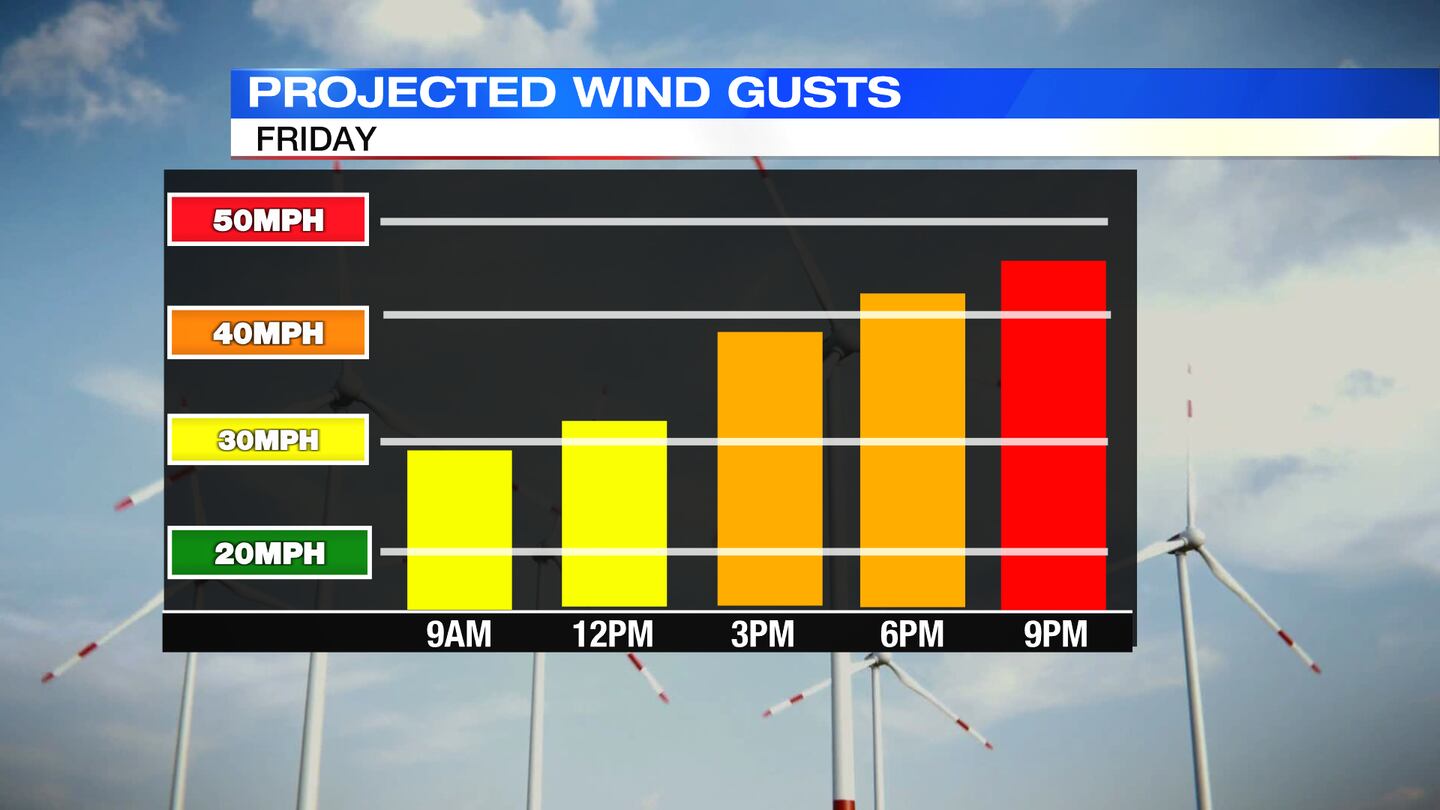 Highs climb to the middle 40s. Very windy with some gusts exceeding 40MPH. Friday night, moisture is pulling away as colder air arrives. The overlap of whatever moisture is left will result in some light snow showers.