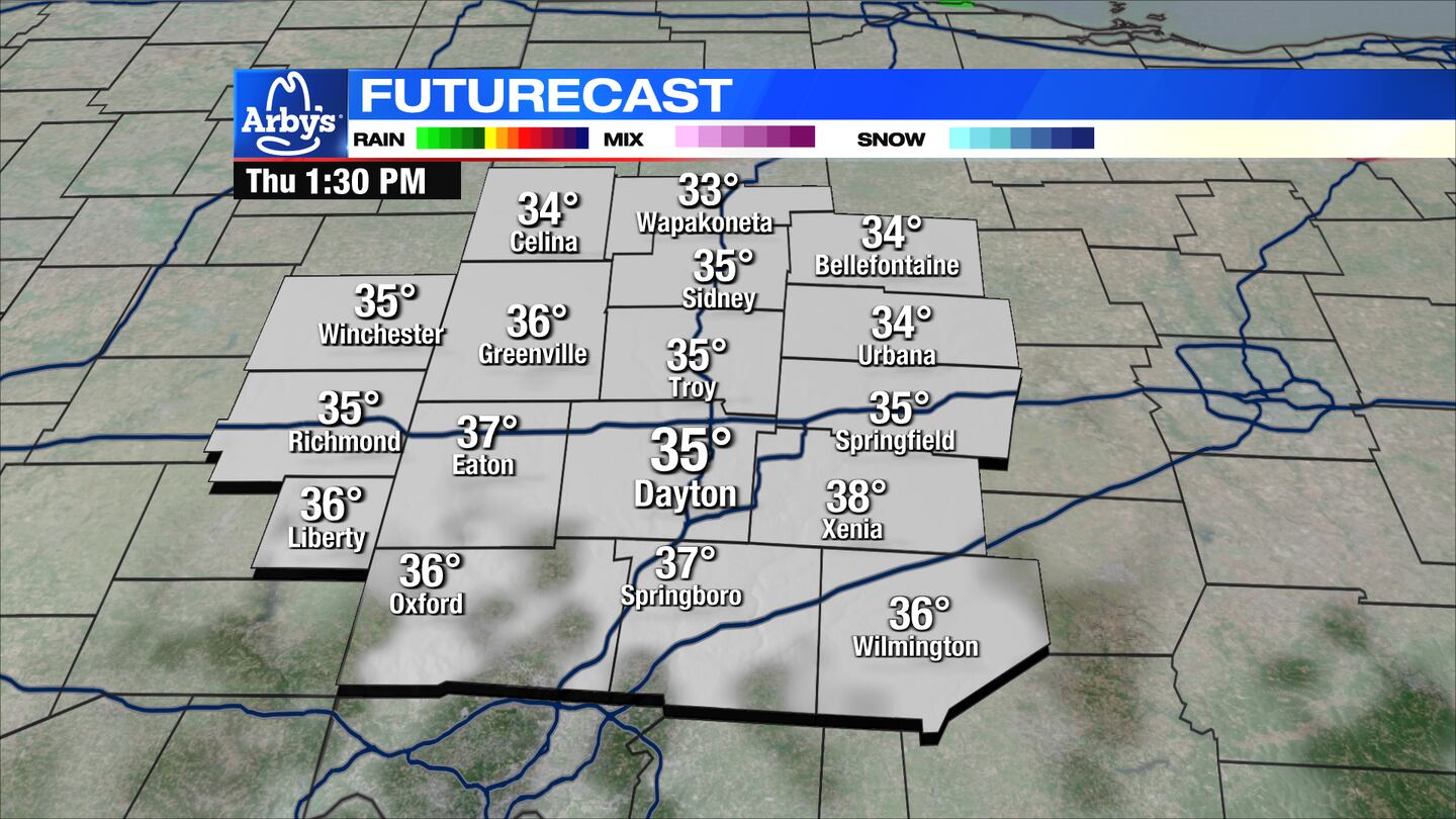 THURSDAY: Mostly cloudy. A few snow showers are possible early, mainly in the northern Miami Valley. Mainly dry for the afternoon. Highs near 40.