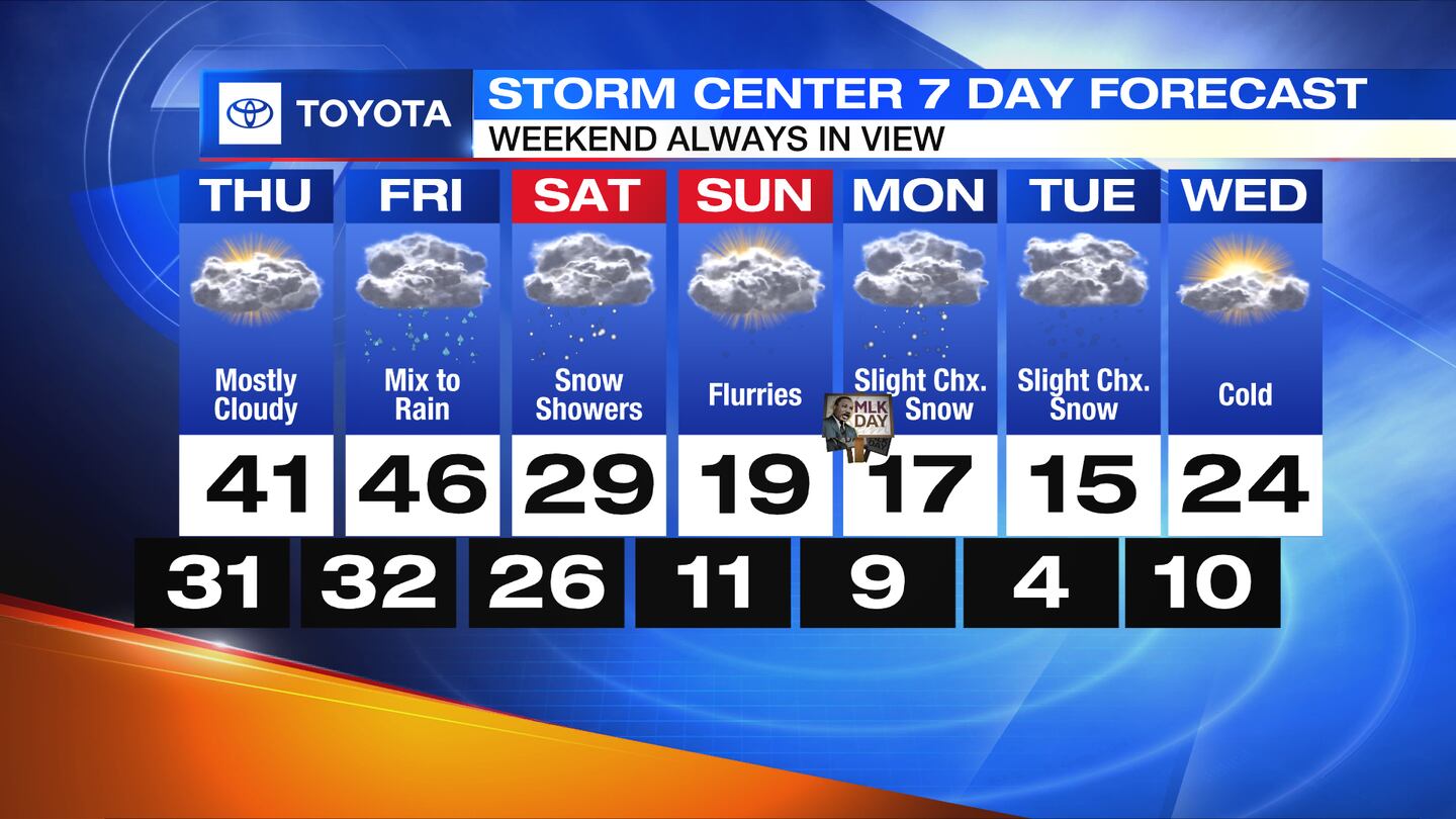 SATURDAY: Snow showers are possible, especially early Saturday. An early look at accumulations suggests they should be light, generally less than 1 inch. Colder air begins to arrive and daytime highs only rebound to the upper 20s.